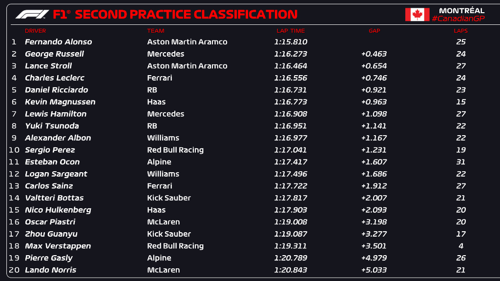 Fernando Alonso je bil najhitrejši na drugem prostem treningu Formule 1 pred VN Kanade, medtem ko se je aktualni svetovni prvak Max Verstappen ubadal s tehničnimi težavami.
