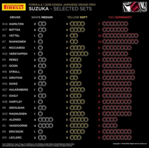 Ferrari has chosen a very agressive aproach to their Japanese grand prix tyre choice. The Maranello squad chose the most supersoft tyres of all teams. The Italian team chose ten sets of the softes rubber for the Suzuka event, leaving only two sets of soft compound tyres and one set of medium.