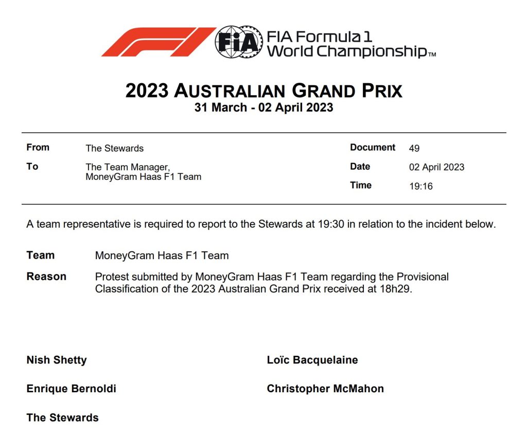 Ameriško moštvo Haas je vložilo protest na rezultate dirke F1 za VN Avstralije, na kateri je zmagal Max Verstappen pred Lewisom Hamiltonom in Fernandom Alonsom.