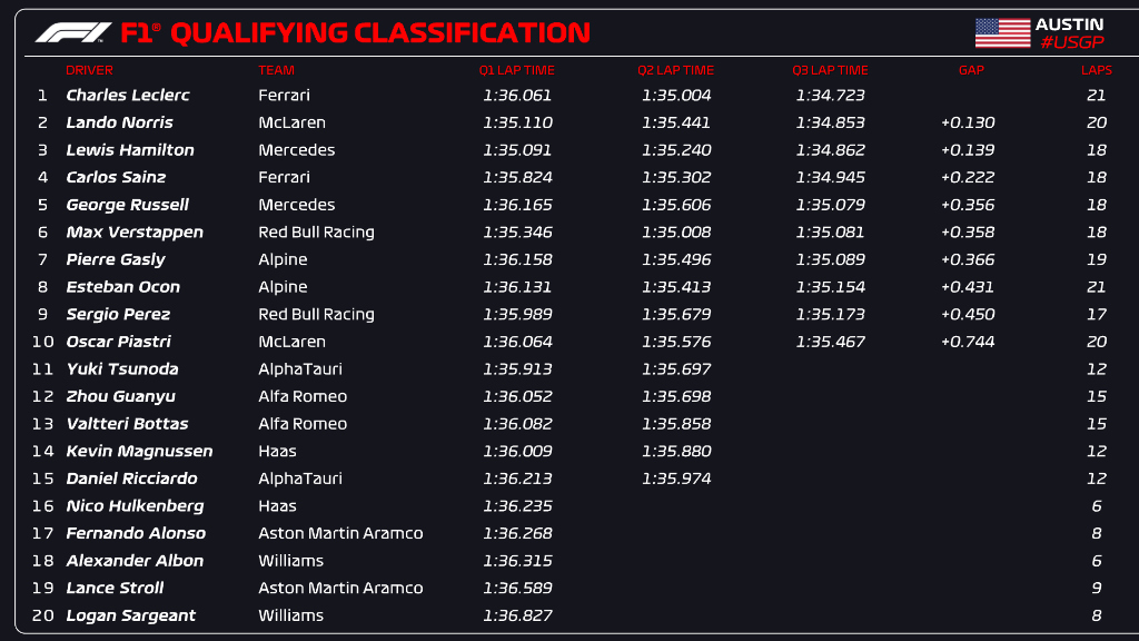 V prvi štartni vrsti bo dirko začel tudi Lando Norris, za njima pa sta se uvrstila Lewis Hamilton ter Carlos Sainz. George Russell je bil peti, Pierre Gasly sedmi, Esteban Ocon osmi, Sergio Perez, ki je pokvaril Verstappnov prvi hitri krog v Q3 je bil deveti, Oscar Piastri pa deseti.