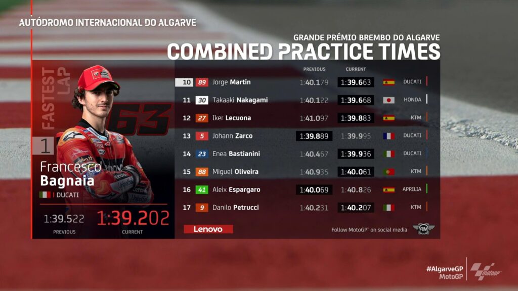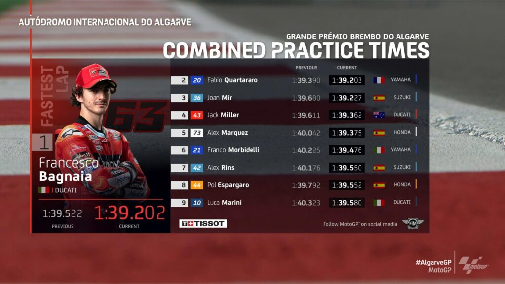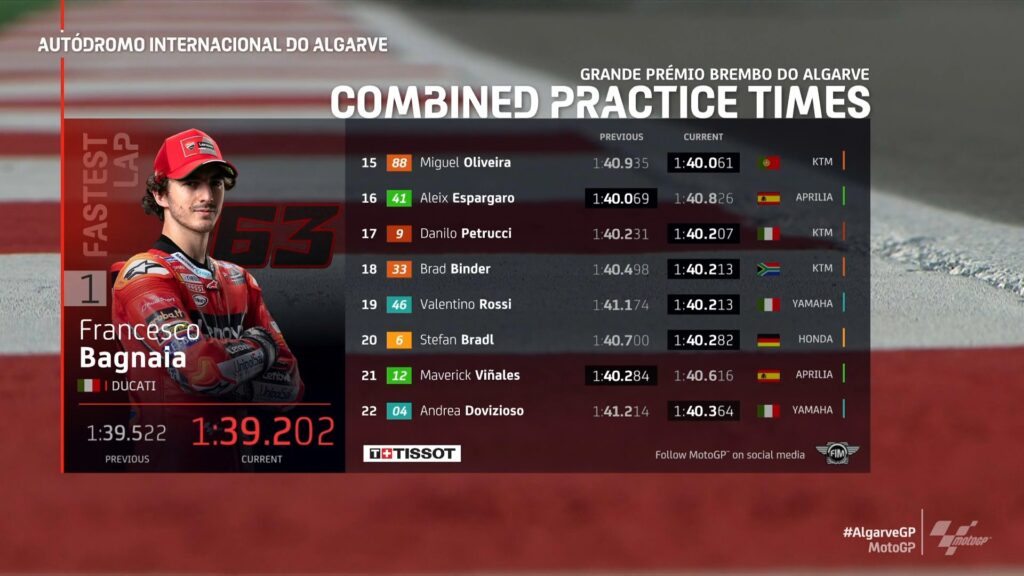 Dirkač Ducatija Francesco Bagnaia je bil najhitrejši na tretjem prostem treningu MotoGP za VN Algarve, kjer pa je najbližjega tekmeca Fabia Quartararoja ugnal le za tisočinko sekunde.