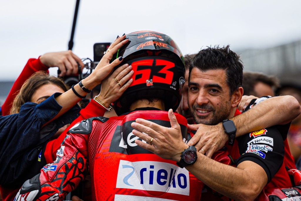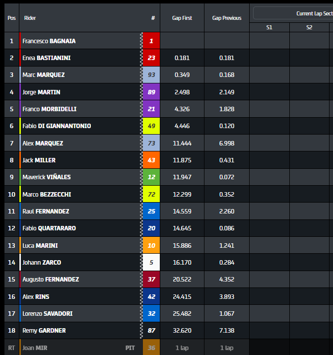 Bagnaia je na začetku dirke sicer povedel, a ga je Acosta prehitel in poskušal pridobiti udobno prednost, pri tem pa padel ter odstopil. V nedeljo ima priložnost popravnega izpita, potem ko je na kvalifikacijah osvojil prvio najboljši štartni položaj v MotoGP, ter tudi uradno postal najboljši novinec letošnje sezone.
