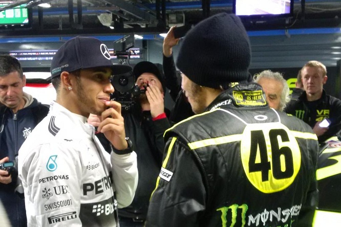 Lewis Hamilton in Valentino Rossi, svetovna prvaka Formule ena in MotoGP, sta na dogodku, ki ga je omogočil sponzor moštev Mercedes in Yamaha, v Valencii v začetku tedna zamenjala svoja dirkalnika. Čeprav so navijači nestrpno čakali na fotografije in video posnetke, pa le teh ni na spregled, saj mediji na dirkališče niso imeli vstopa.