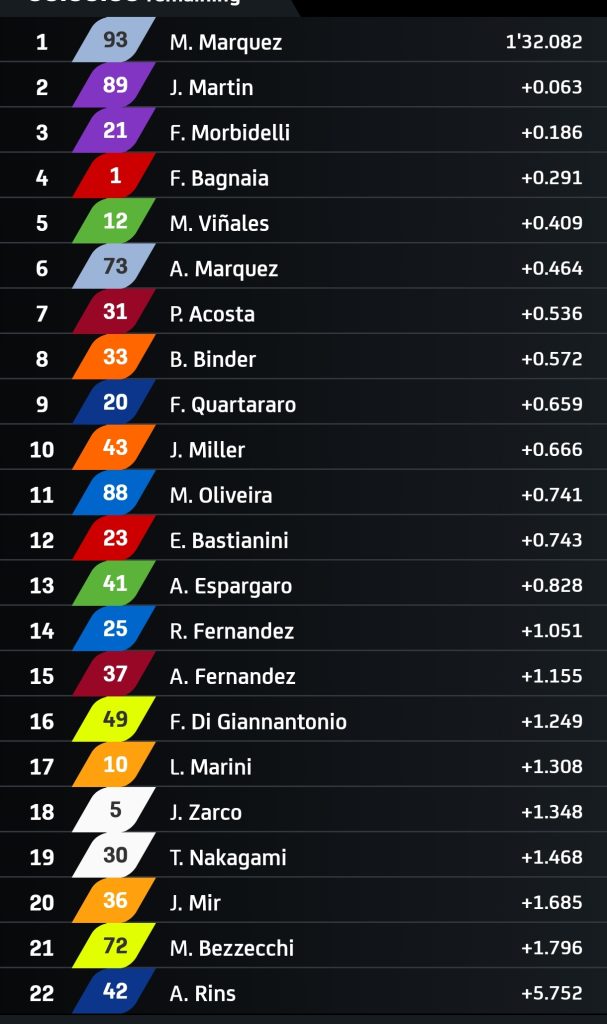 Francesco Bagnaia je postavil četrti čas treninga, z 0.291 sekunde zaostanka. Peti je bil Maverick Vinales pred Alexom Marquezom, Pedro Acosto, Bradom Binderjem, Fabiom Quartararojem, ter Jackom Millerjem.