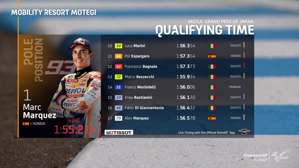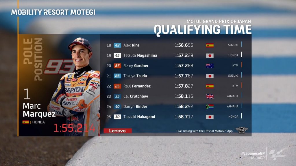 Marc Marquez je na kvalifikacijah za VN Japonske osvojil prvi pole position po 1071 dneh. Kvalifikacije so se začele 90 minut kasneje od predvidenega, zaradi dežja, ki ga je na stezo prinesel tajfun Talas. Ob Špancu bosta dirko iz prve štartne vrste začela Johann Zarco ter Brad Binder, prav vsi tekmeci za naslov svetovnega prvaka pa so se uvrstili nižje od petega mesta.
