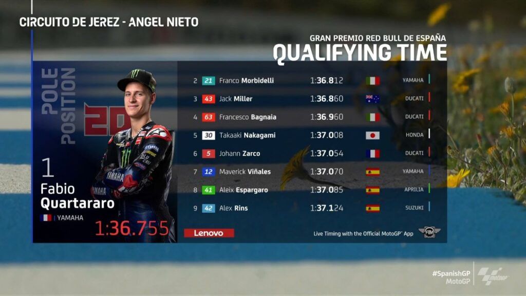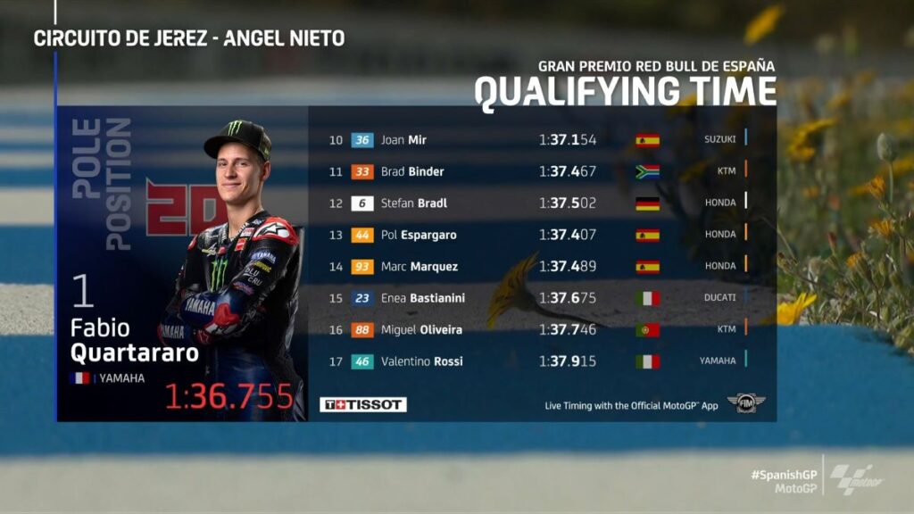 Fabio Quartararo bo nadaljevanje zmagovalnega niza na VN Španije v Jerezu načrtoval z najboljšega štartnega položaja. Tovarniškemu dirkaču Yamahe, ki je osvojil četrti zaporedni najboljši štartni položaj v Jerezu, bosta v prvi štartni vrsti delala Franco Morbidelli in Jack Miller.