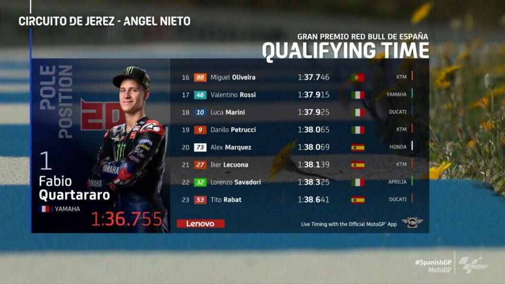 Johann Zarco je bil šesti, pred Quartararojevim moštvenim kolegom Maverickom Vinalesom, ter dirkačem Aprilie, Aleixom Espargarojem. Nekoliko sta razočarala dirkača Suzukija. Alex Rins je bil deveti, aktualni svetovni prvak Joan Mir pa deseti.