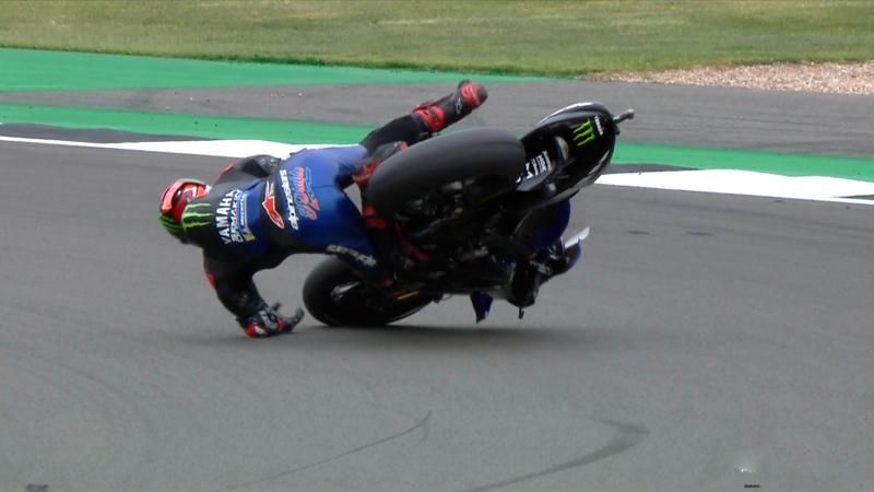 Fabio Quartararo je bil najhitrejši na popoldanskem treningu razreda MotoGP v Silverstonu, kjer pa je Francoz grdo padel. Po padcu se je vrnil na stezo in ni kazal znakov poškodb, čeprav je utrpel močan udarec v desni gleženj.