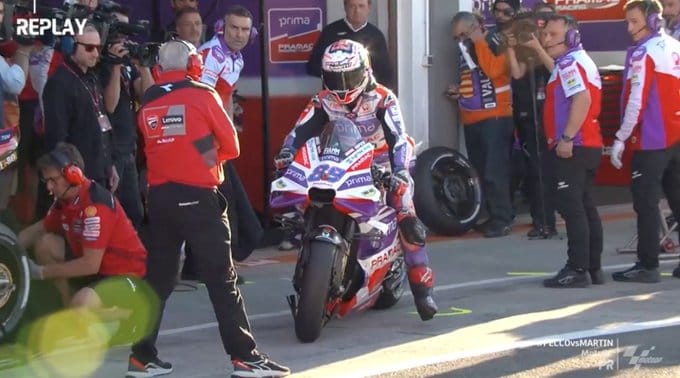 Martin, ki za Bagnaio zaostaja za 21 točk, je bil na treningu drugi, s čimer si je zlahka zagotovil vstop v hitrejšo kvalifikacijsko skupino, medtem pa si je vzel čas in se poigral z Bagnaio, kateremu je ves čas sledil, celo široko skozi izletno cono. Igro je poskušal končati šef Ducatijevega moštva, Davide Tardozzi, ki je stopil pred motocikel Martina v upanju, da svojemu dirkaču omogoči “čisto” stezo. Bagnaia je očitno podlegel miselnim igricam Španca, edino preostalo priložnost, da se uvrsti v drugi del kvalifikacij pa je izgubil, ko je v hitrem krogu naletel na rumene zastave.