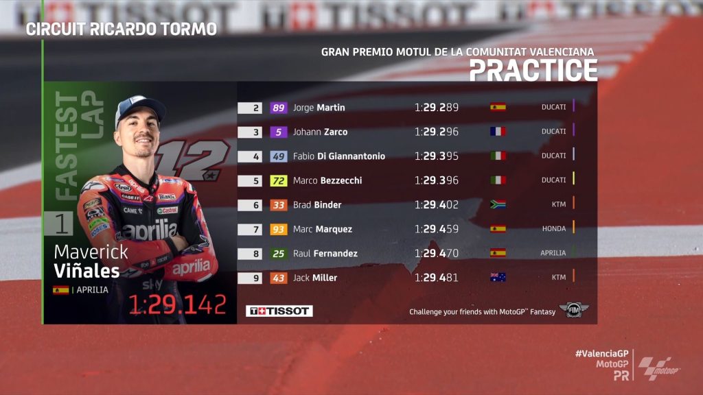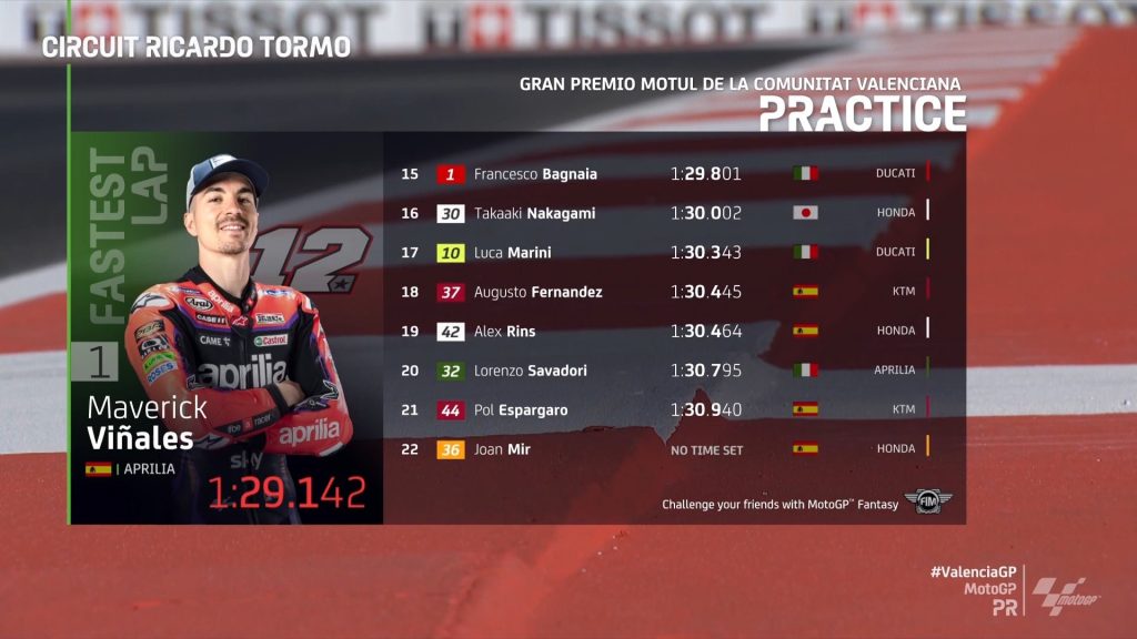 Trening je tako končal na petnajstem mestu in se bo za vstop v Q2 boril že v začetku kvalifikacij. Na treningu je bil znova zelo hiter Fabio Di Giannantonio, medtem ko se je v prvo peterico uvrstil tudi Marco Bezzecchi. Šesti je bil Brad Binder, sedmi Marc Marquez, osmi Raul Fernandez, deveti JAck Miller, ter deseti Aleix Espargaro.